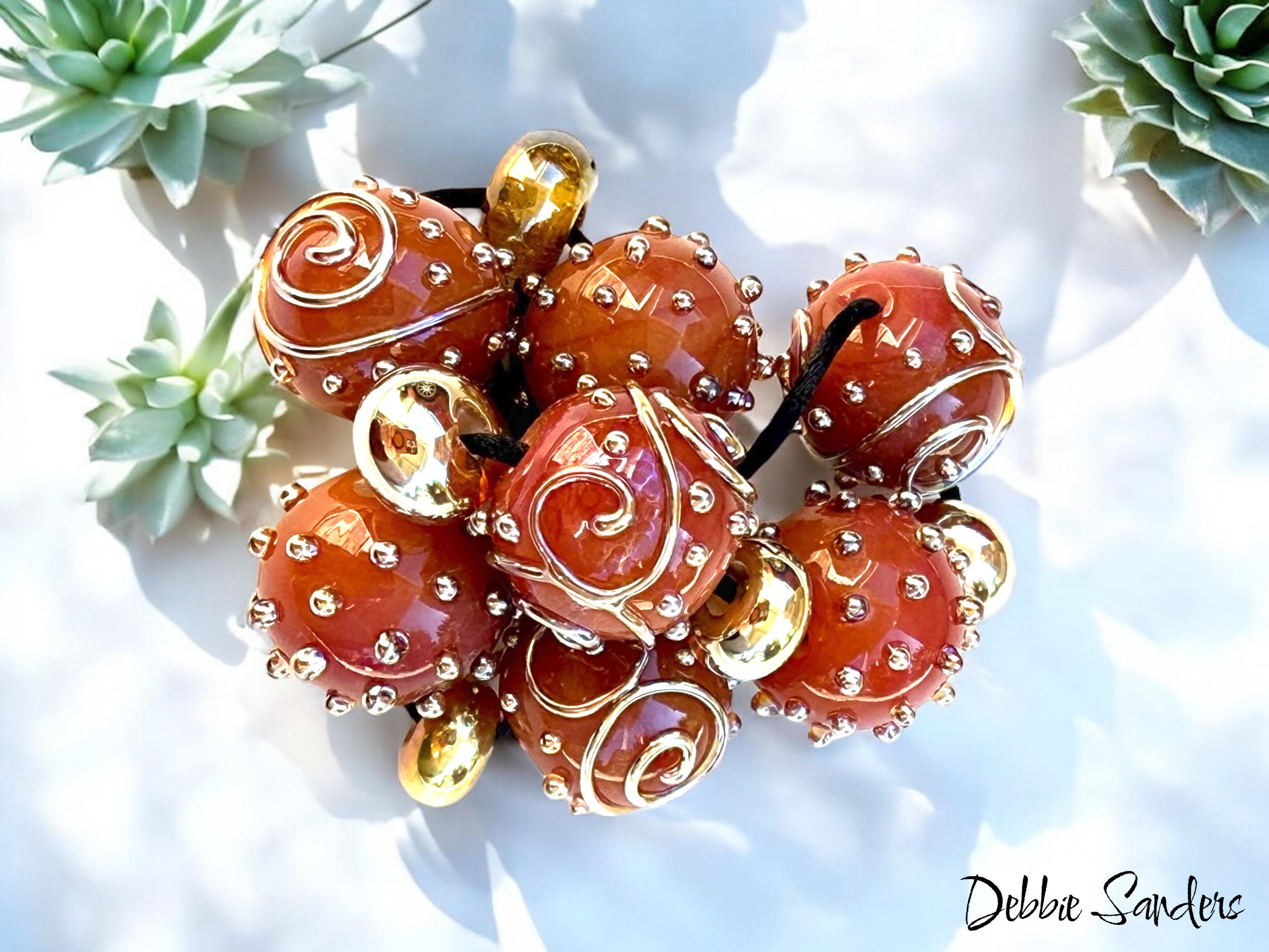 A beautiful OrGaNiC set of 7 handmade glass beads (16 mm each bead) made in a rich color shifting peach pink. Accents include silver glass dots and stringer work. Silver glass spacers are included. This is a ready made set that can be shipped right away!