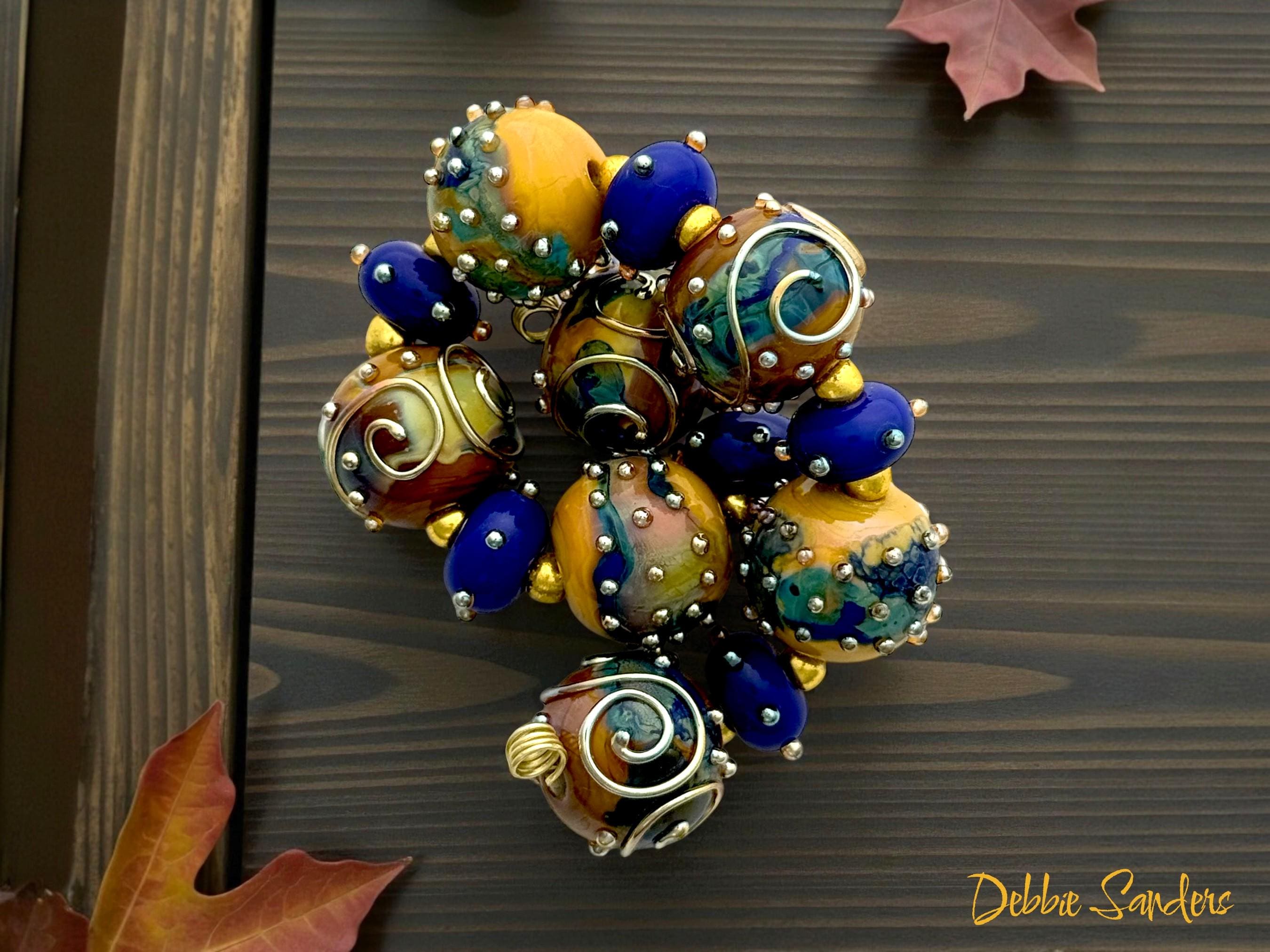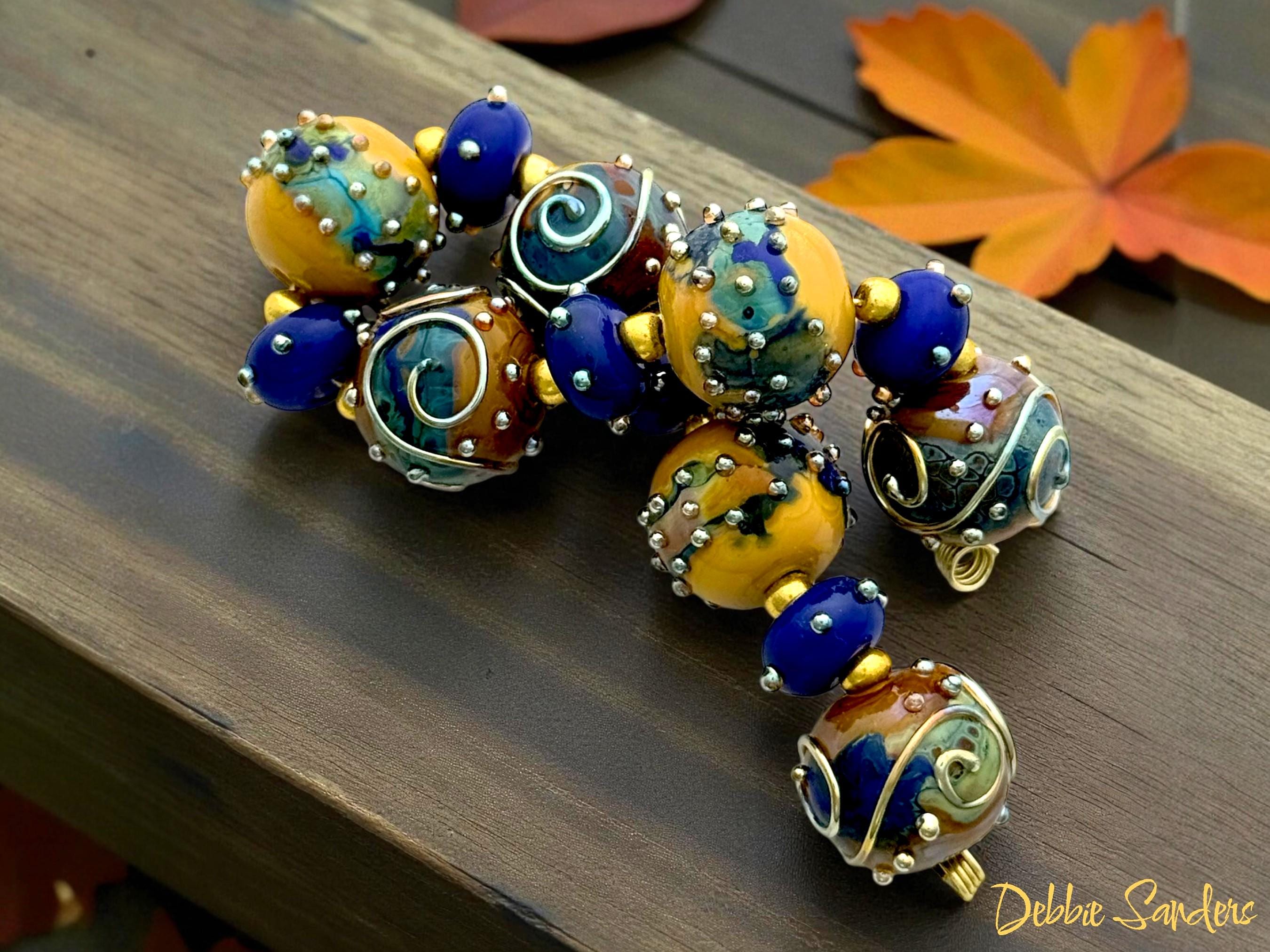 A beautiful OrGaNiC set of 7 handmade glass beads (16 mm each bead) made in fall shades of browns, teal and blues. Accents include silver glass dots and stringer work. Handmade glass spacers are included. This is a ready made set that can be shipped right away!