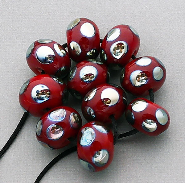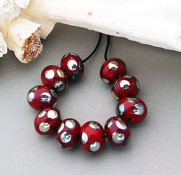 "Christmas Red" A beautiful OrGaNiC set of 10 luscious red handmade lampwork glass beads with silver glass dots. Measurements are roughly .50" (12-13 mm) in diameter for each lampwork bead. Keep in mind that this is a made to order bead set and because so it will be unique but similar to the pictures. Please give me 2-4 weeks to finish your lampwork beads. If I need to order any special items for your lampwork beads, then that may increase the 2 week time frame. My lampwork beads are good for jewelry making projects and craft projects.