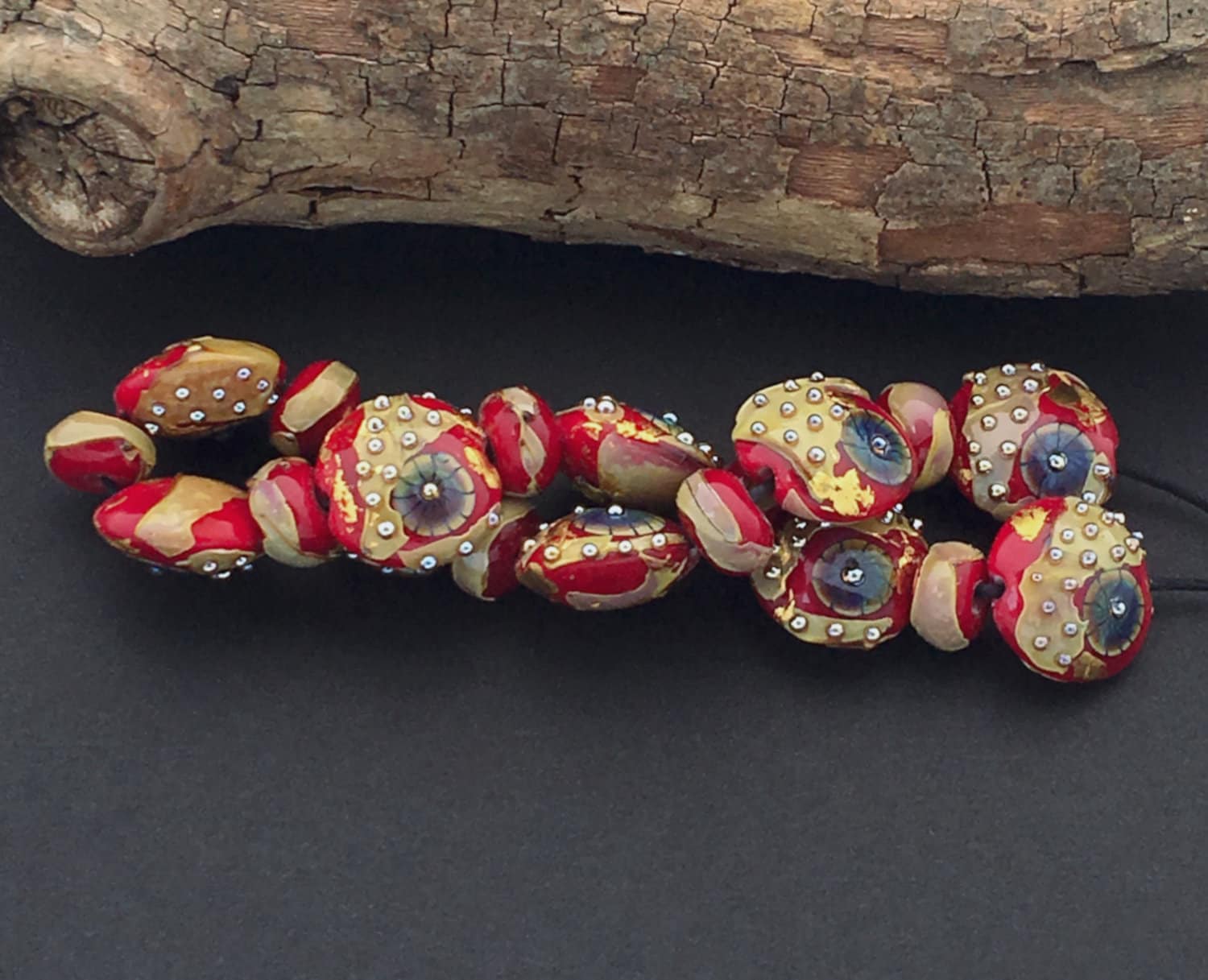 "Red Lentils" A beautiful OrGaNiC set of 10 glass lentils (spacers are also included) made in a base of a rich medium red. Accents include silver glass dots, handmade blown raku shards and murrini. Each lentil has a touch of 24k gold leaf. Measurements are .75" (18 mm) for each lentil. Give me 2-4 weeks to finish your beads. If I need to order any special items for your beads, then that may increase the time frame.